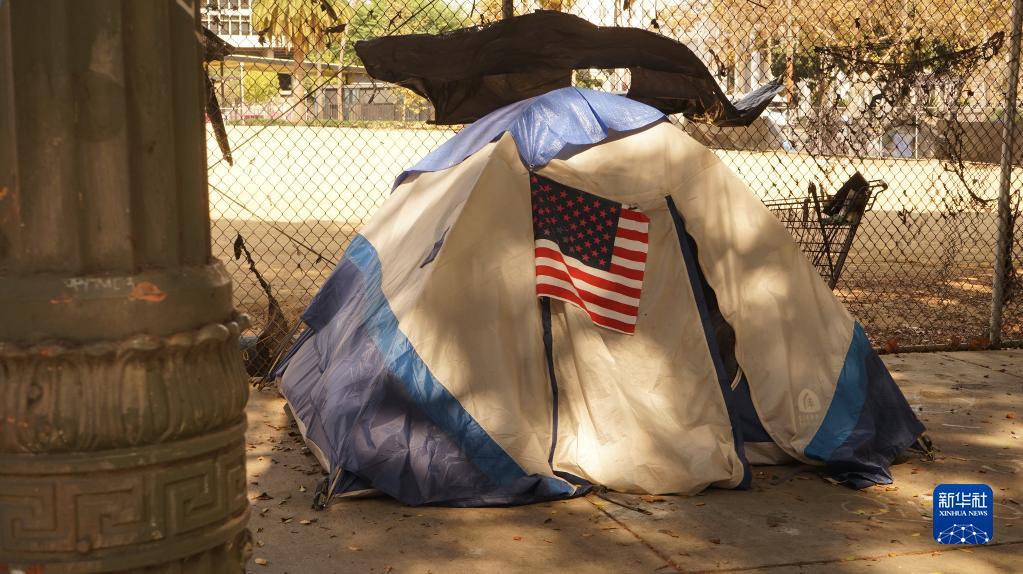 這是9月8日在美國加利福尼亞州洛杉磯市區拍攝的無家可歸者的帳篷。