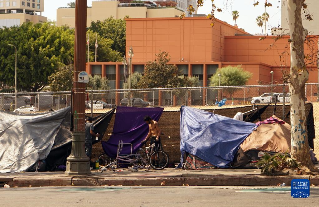 9月8日,在美國加利福尼亞州洛杉磯市區,街頭可見多個無家可歸者的帳篷。