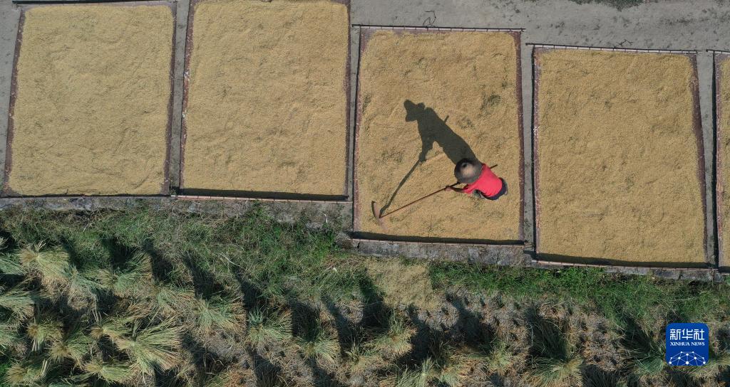 9月9日,在湖南婁底紫鵲界梯田,一位村民在自家門前曬谷(無人機照片)。