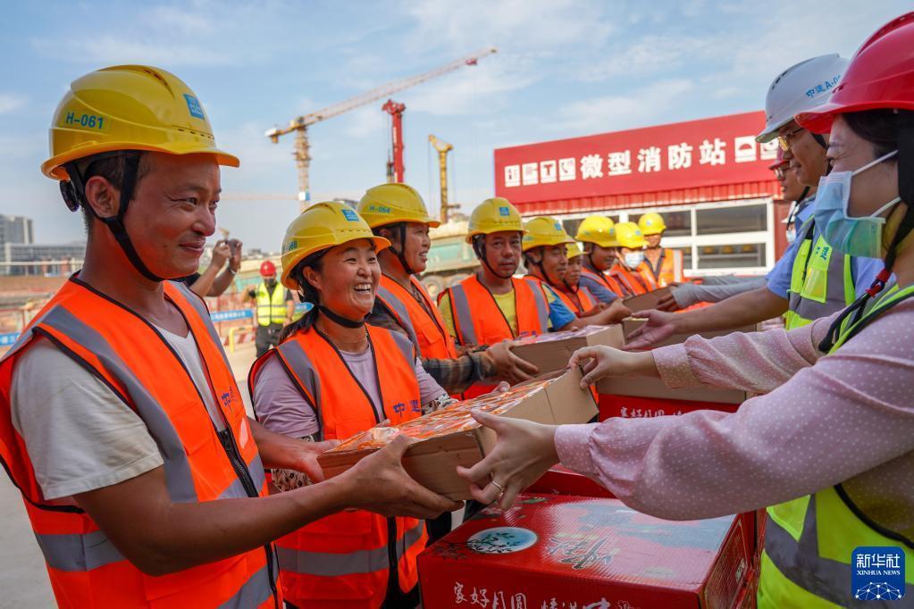 9月8日,在濟南浪潮智能計算產業園建設項目現場,參與項目的建設者在領取月餅。