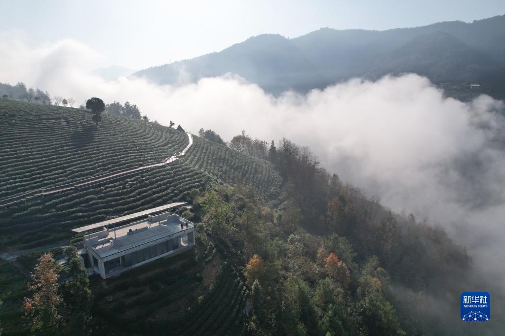 安康市紫陽縣向陽鎮營梁村茶山景色(2021年11月24日攝,無人機照片)。漢江流過的紫陽縣茶園面積達25萬畝。
