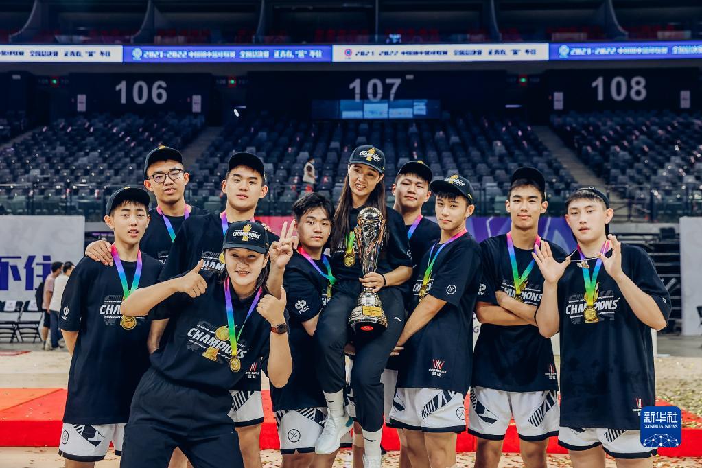 8月19日,明德華興中學獲得2021-2022賽季中國初中籃球聯賽男子組總冠軍后,于紅?。ㄓ椅澹┖完爢T們合影。