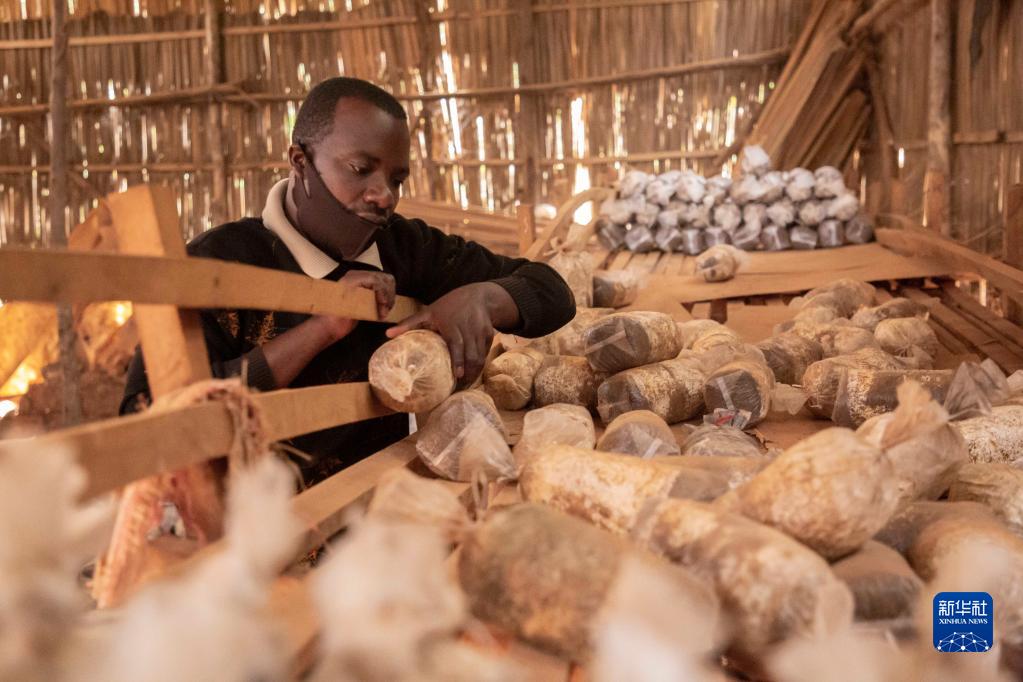 2020年9月9日,在盧旺達首都基加利的一家食用菌培育作坊,作坊主人埃馬紐埃爾·阿希馬納檢查菌袋。中國福建農林大學的菌草專家2006年來到盧旺達開始菌草技術合作項目,在當地示范和推廣菌草技術?!袄镁菁夹g種植食用菌,在盧旺達現在可是一項利潤豐厚的生意,這對人們擺脫貧困很有幫助,”曾經為全家衣食煩心的阿希馬納說,“我有4個孩子,菌草技術帶來的收入,除去孩子學費和生活開支,我還能存下一些資金繼續壯大自己的生意。中國人的菌草技術,讓我和其他很多人受益?!?/p>