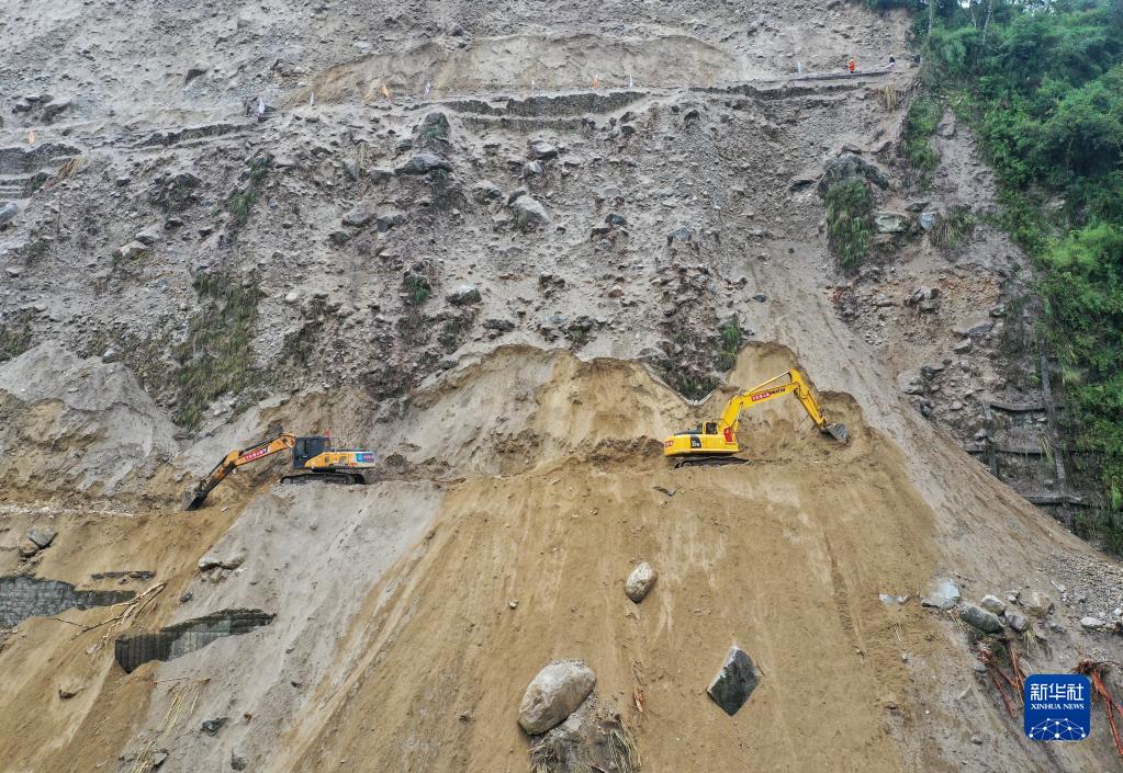 9月9日,搶險人員在搶通磨西鎮附近道路(無人機照片)。