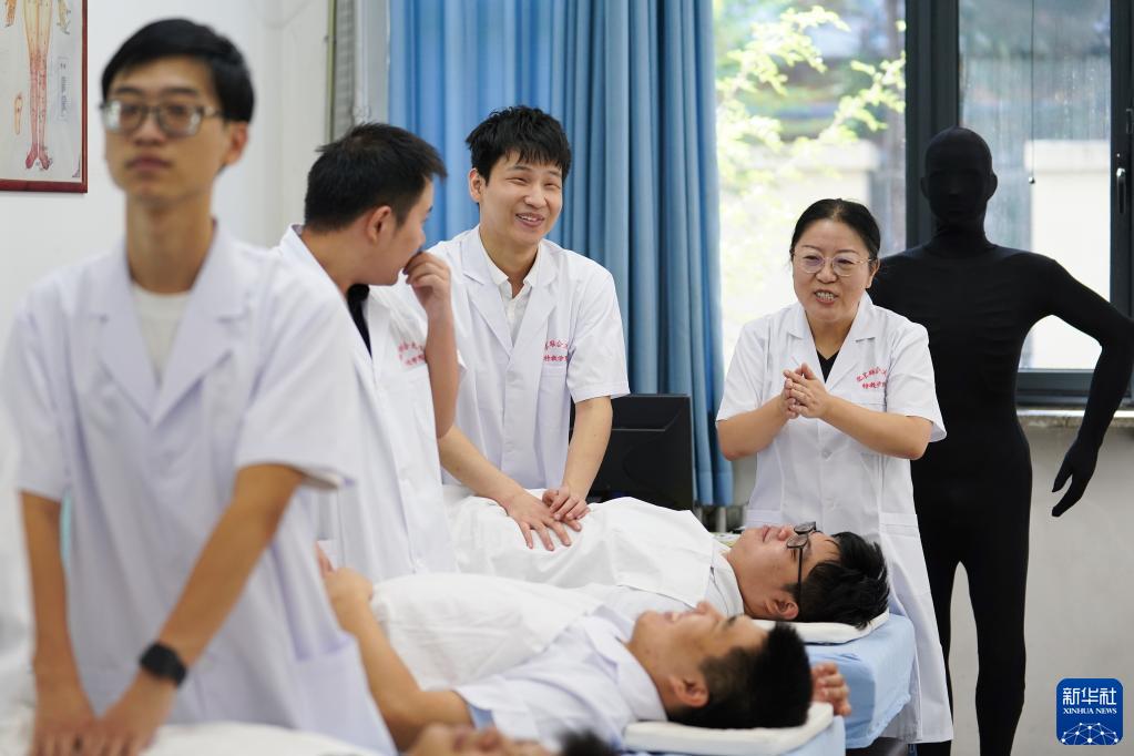 在北京聯合大學保健按摩實訓課上,張琳(右一)為視障學生教授保健按摩課程(9月8日攝)。