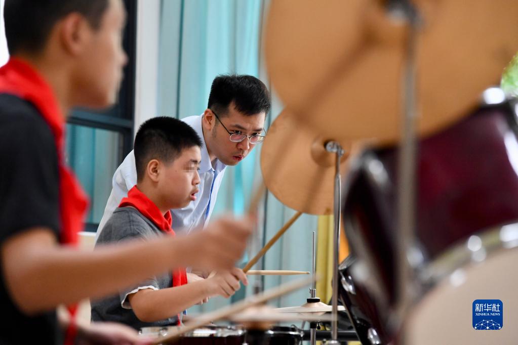福州市星語學校教師黃燦在指導學生敲架子鼓(9月7日攝)。