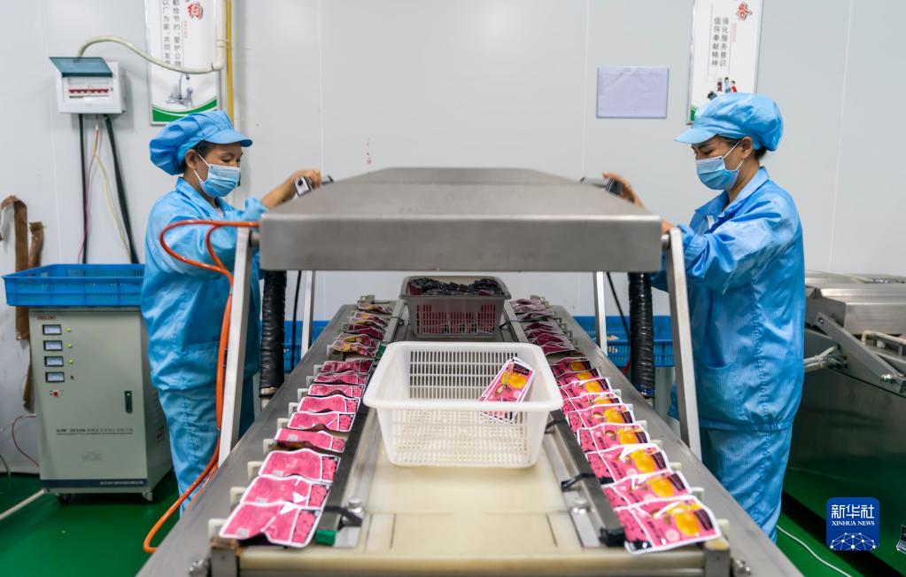 9月9日,在祿豐市中村鄉一家板栗加工企業,工作人員將裝袋的板栗封口。