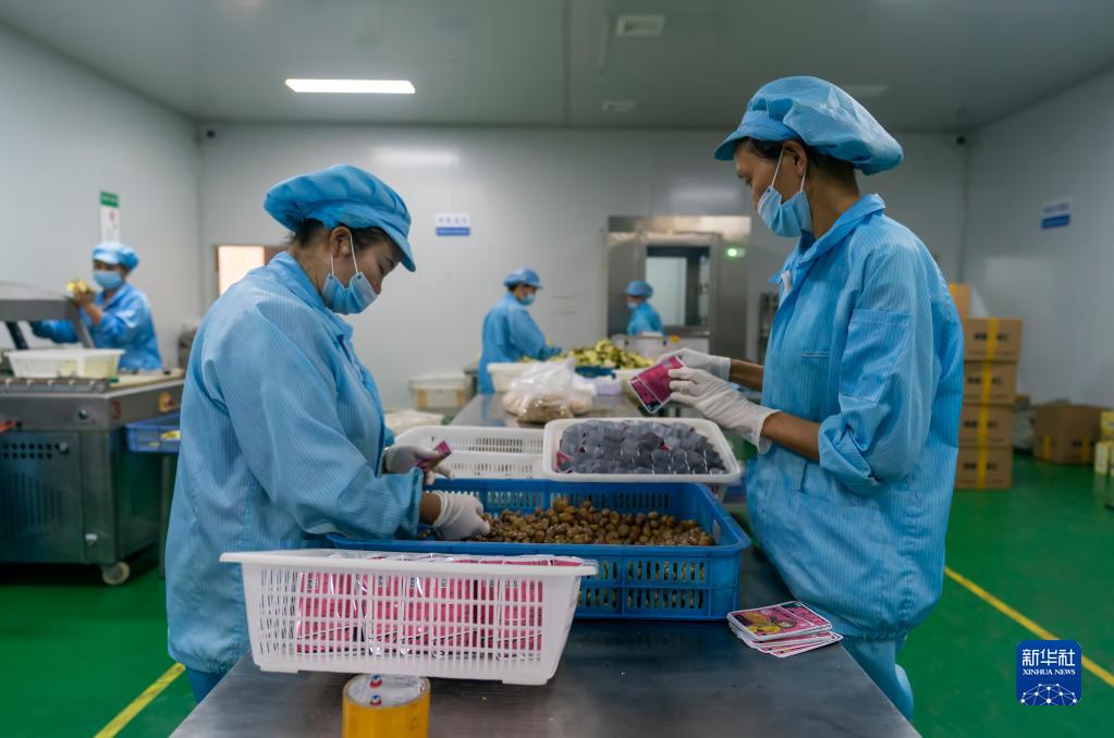 9月9日,在祿豐市中村鄉一家板栗加工企業,工作人員將板栗裝袋。