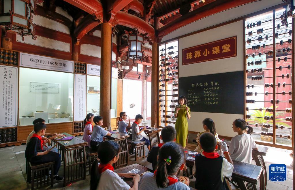 9月7日,在安徽省黃山市程大位博物館,汪素秋在公益珠算小課堂上帶領孩子們制作算盤,培養孩子們對珠算的興趣。