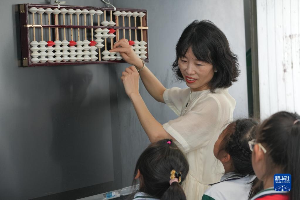 9月6日,在安徽省黃山市屯溪大位小學,汪素秋在課堂上教授學生們珠算知識。