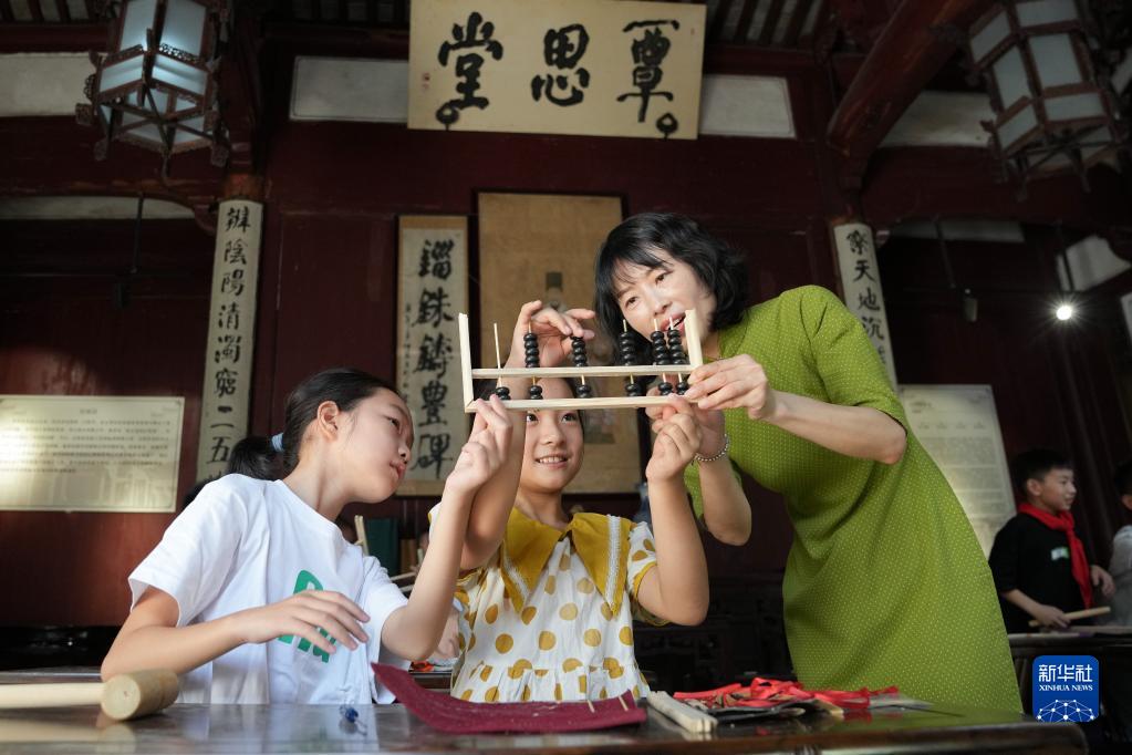 9月7日,在安徽省黃山市程大位博物館,汪素秋在公益珠算小課堂上帶領孩子們制作算盤,培養孩子們對珠算的興趣。