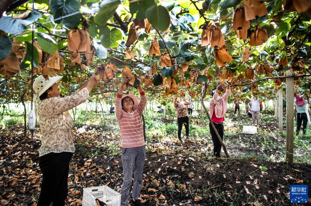 9月9日,當地村民在陜西齊峰果業城固基地為獼猴桃摘除套袋,讓獼猴桃接受光照。