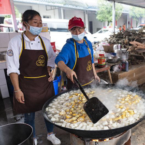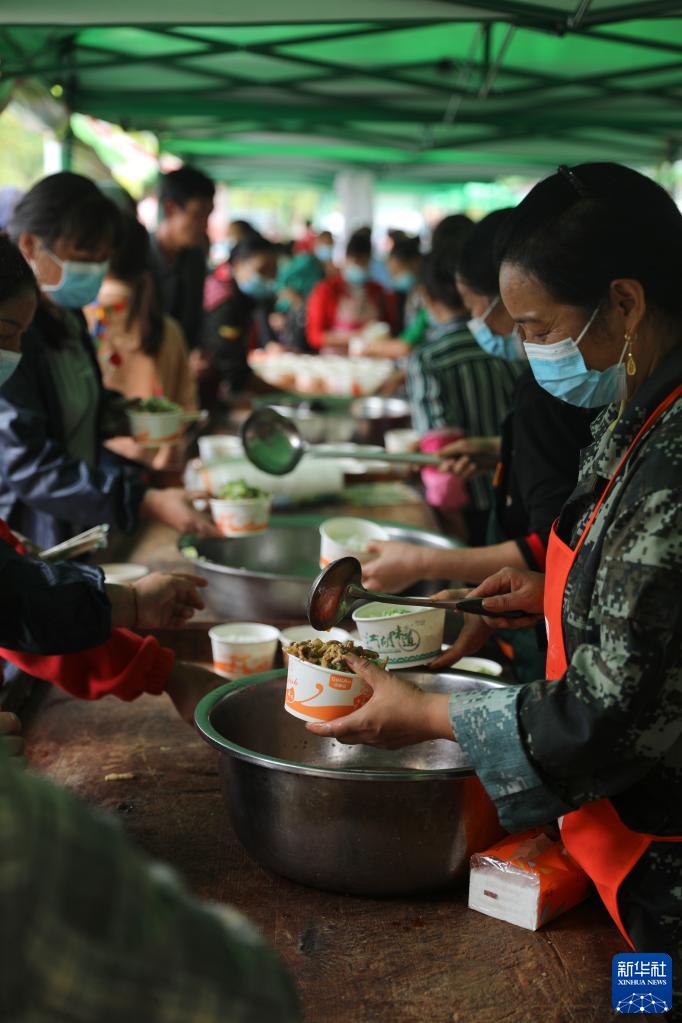 9月9日,在石棉縣王崗坪鄉安置點,受災群眾和志愿者在發放午飯。