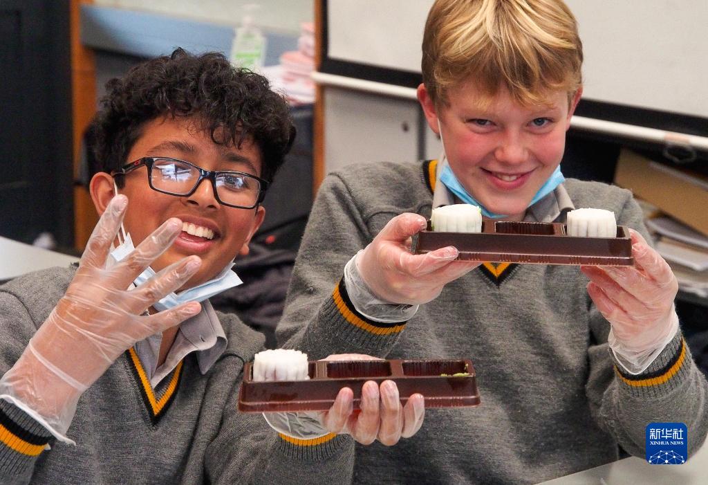 9月5日,在新西蘭惠靈頓男子中學,參加中文課堂的學生制作冰皮月餅。