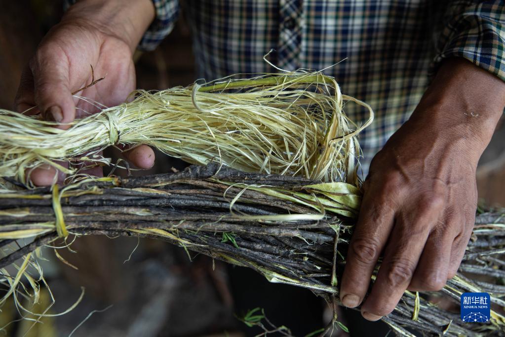 英扎次里將采集的蕘花樹皮晾干(9月5日攝)。