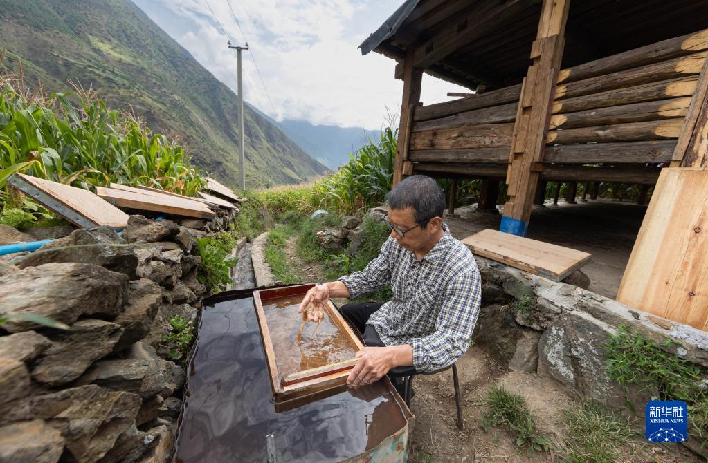 生活在四川省木里藏族自治縣納西族古村寨俄亞大村的英扎次里,是東巴文化省級非遺傳承人。通過不斷研究摸索,他逐漸掌握納西東巴古法造紙技藝。