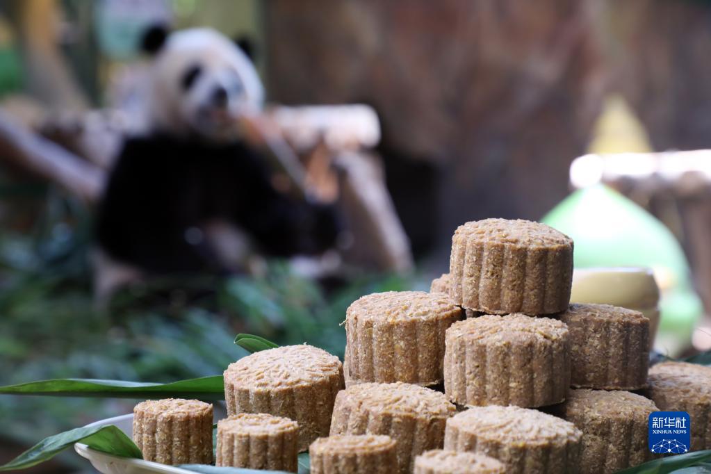 中秋節前夕,廣州長隆野生動物世界工作人員為大熊貓三胞胎“萌萌”“帥帥”“酷酷”準備了特制的“月餅”。大熊貓“月餅”的食材包括竹筍、水果等大熊貓喜愛的食物。
