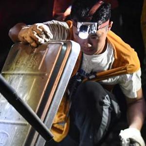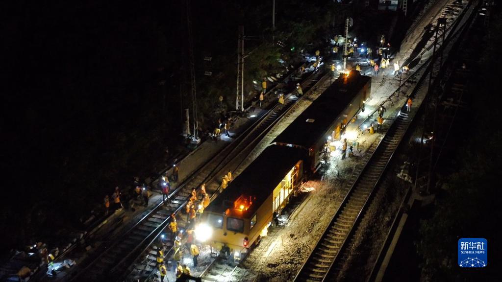 工人在柳州太陽村站進行夜間換岔施工(9月9日攝)。
