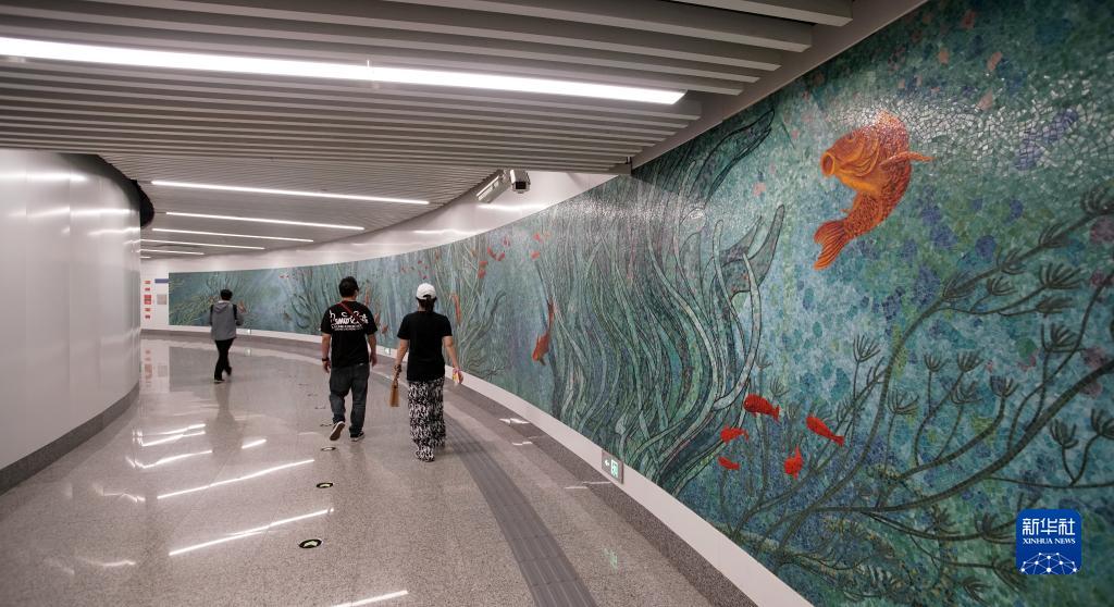 中國山水畫風格的北京地鐵19號線和2號線換乘走廊(9月9日攝)。