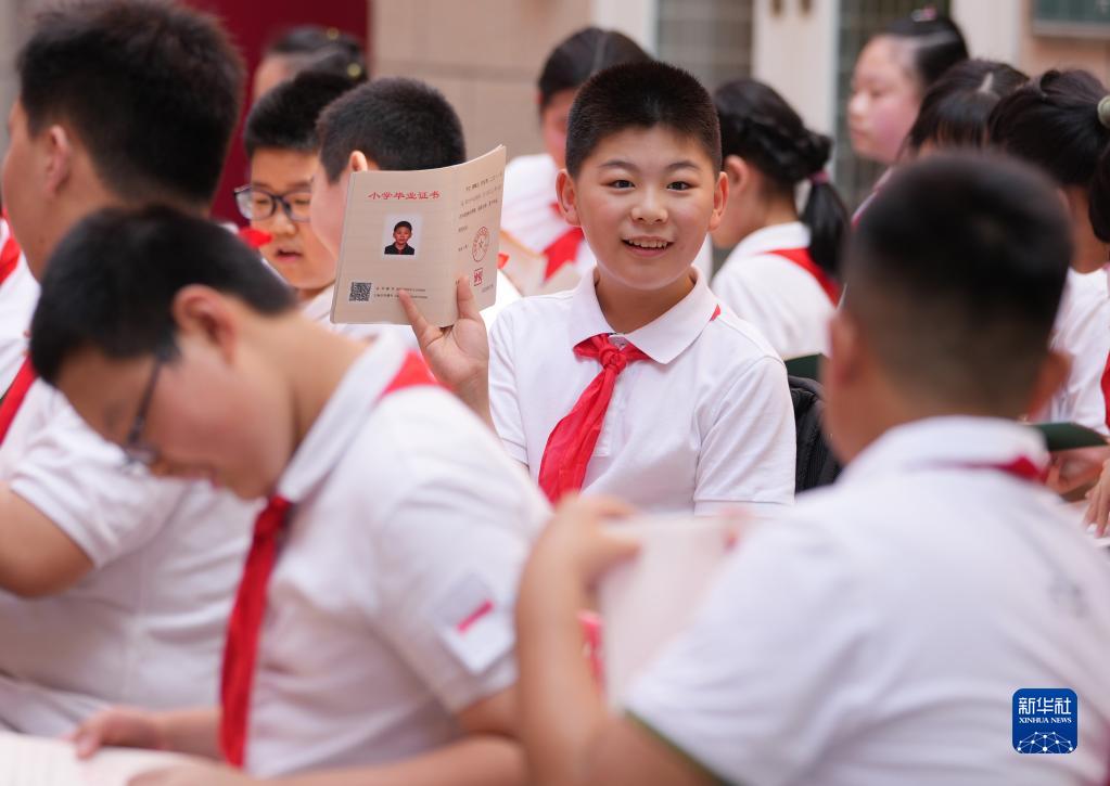 9月10日,蓬萊路二小的返校畢業生向同學展示自己的畢業證書。