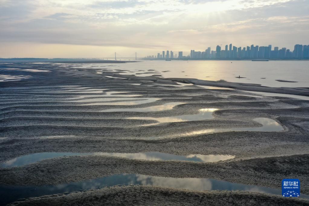 9月10日,長江武漢段部分灘涂裸露(無人機照片)。