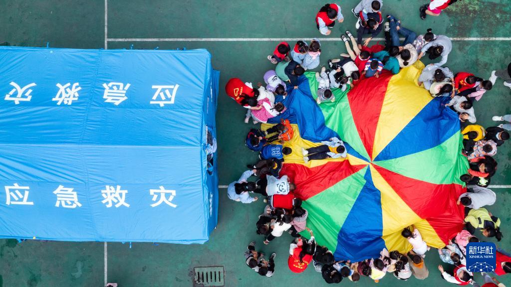 9月10日,在瀘定二中臨時安置點,孩子和志愿者一起玩彩虹傘游戲(無人機照片)。