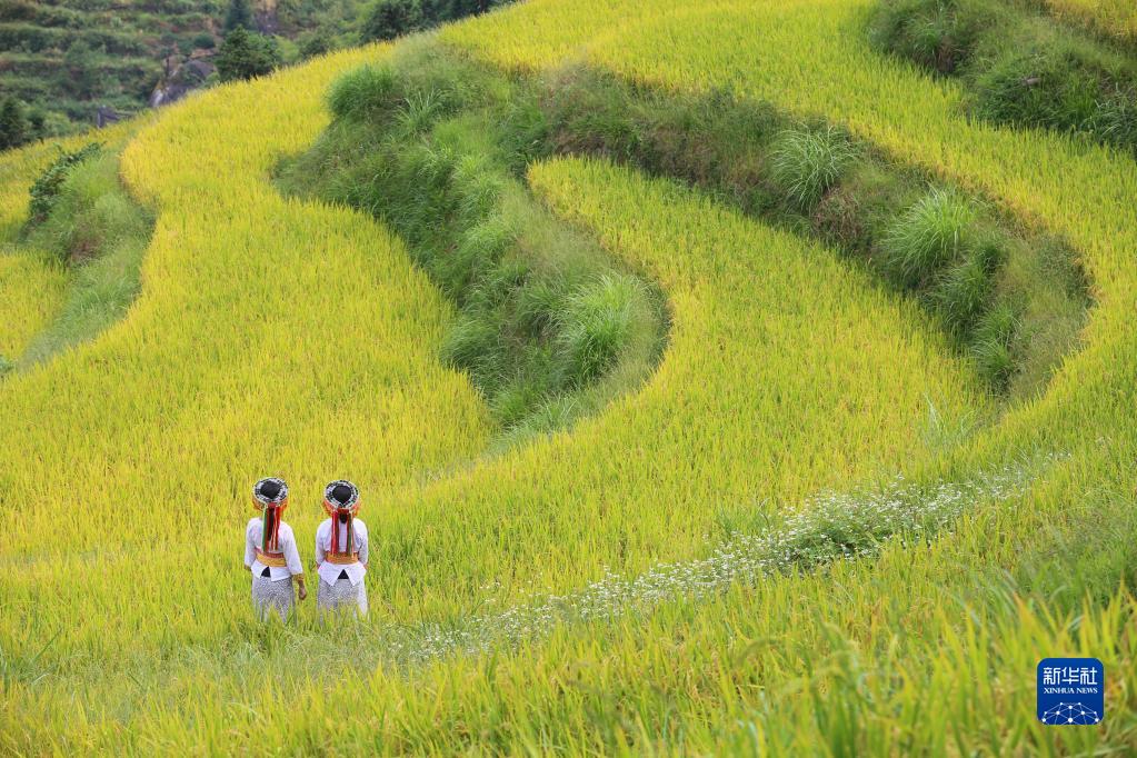 9月10日,游客身著花瑤服飾在湖南省懷化市溆浦縣葛竹坪鎮山背梯田中游玩。