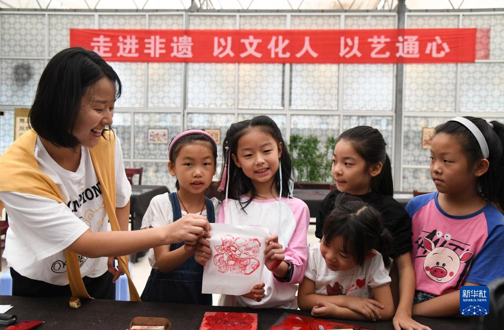 9月10日,在河南省濟源市民俗文化展覽館,一名小學生展示木版印刷的“?!弊?。