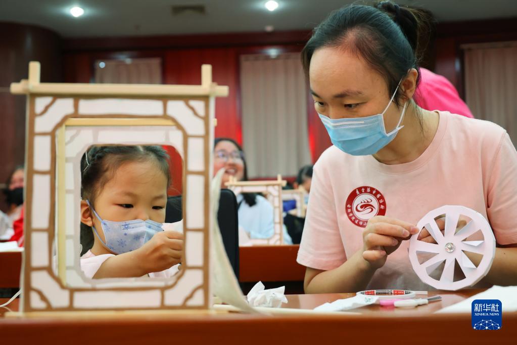 9月10日,在江蘇連云港市博物館,小朋友在家長協助下制作走馬燈。
