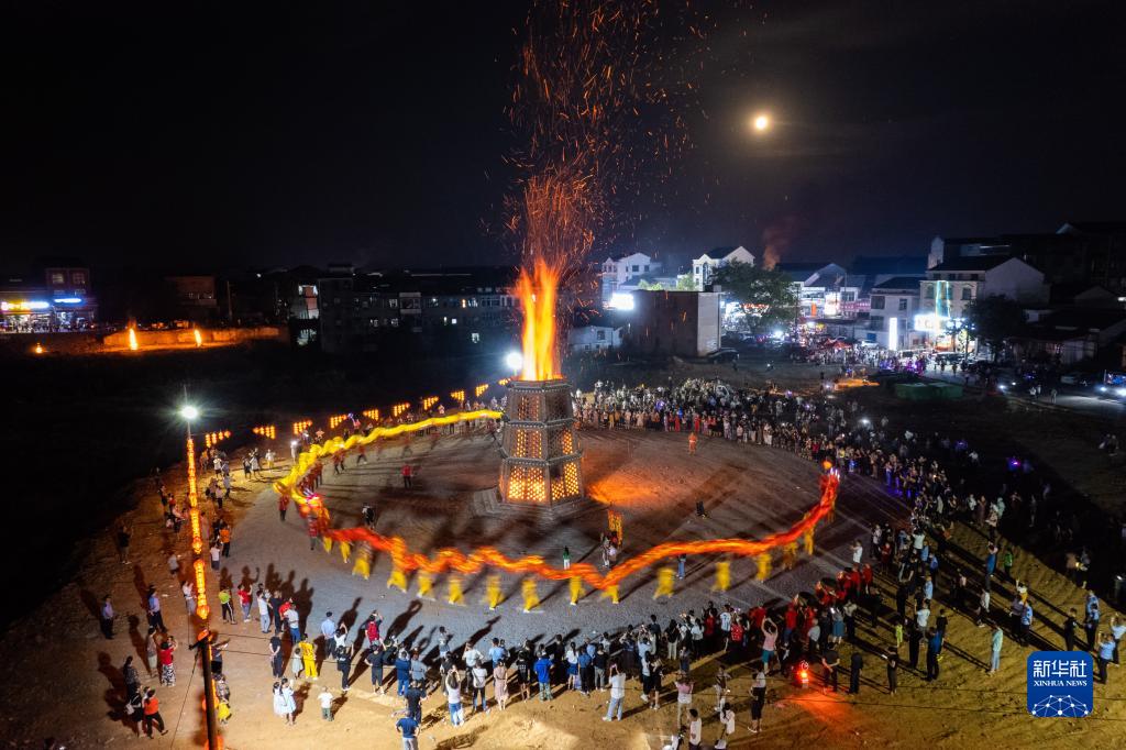 9月10日,在湖南省汨羅市新市鎮,居民舉行“中秋耍寶塔”民俗活動(無人機照片)。