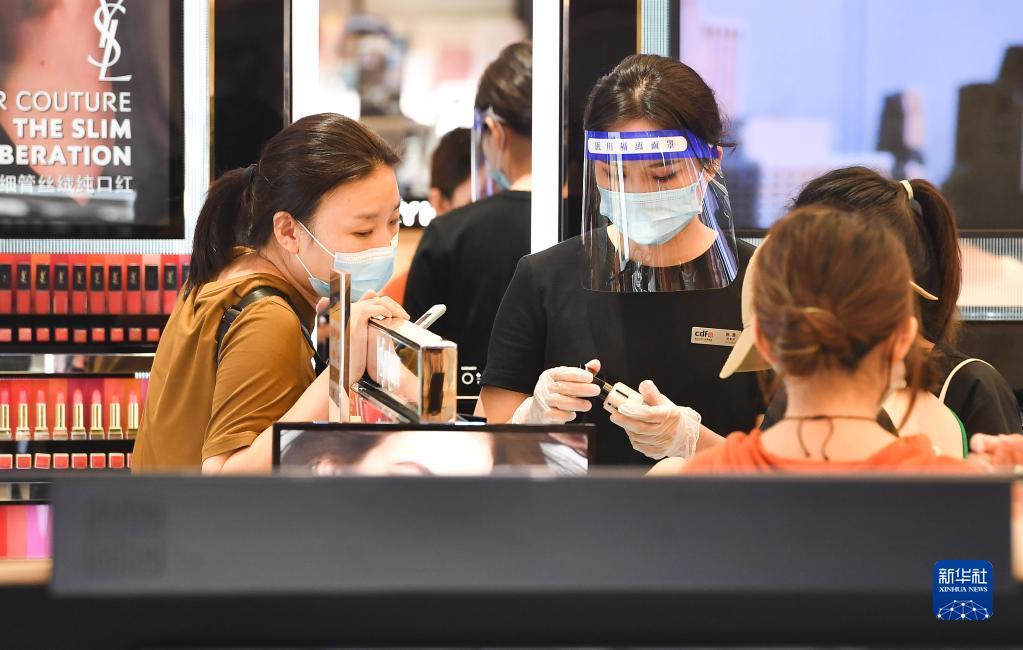 9月10日,游客在中免集團??谌赵聫V場免稅店選購免稅品。