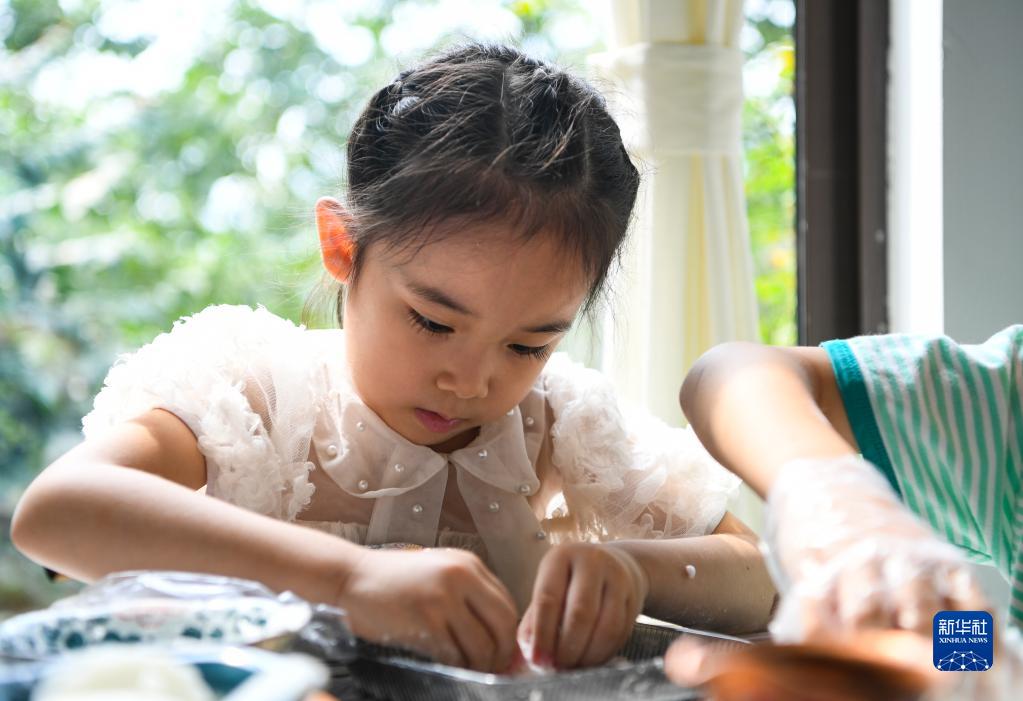 9月10日,小朋友在重慶龍門浩老街學習、體驗月餅制作。