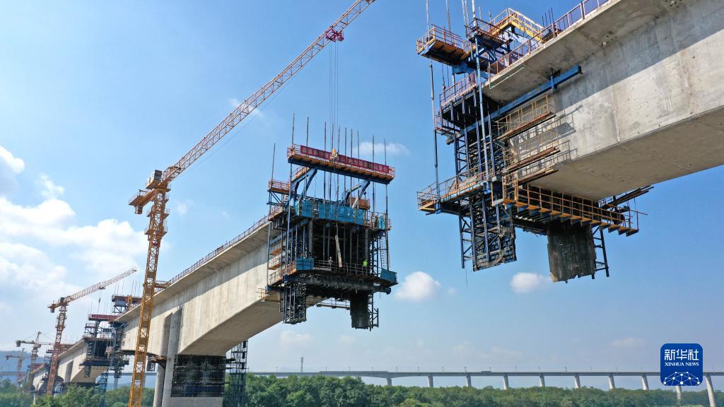 9月10日,建設者在浙江臺州市杭溫高鐵仙居特大橋施工(無人機照片)。