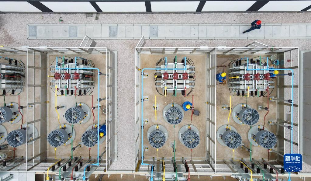 9月10日,工人在位于貴州臺江經濟開發區的220千伏苗江變電站內清潔待投運設備上的灰塵(無人機照片)。