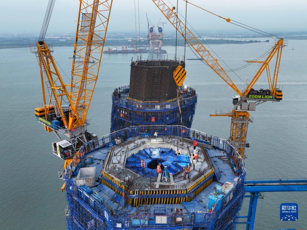 9月10日,中交二航局工人在位于江蘇泰州市的常泰長江大橋建設項目工地作業(無人機照片)。