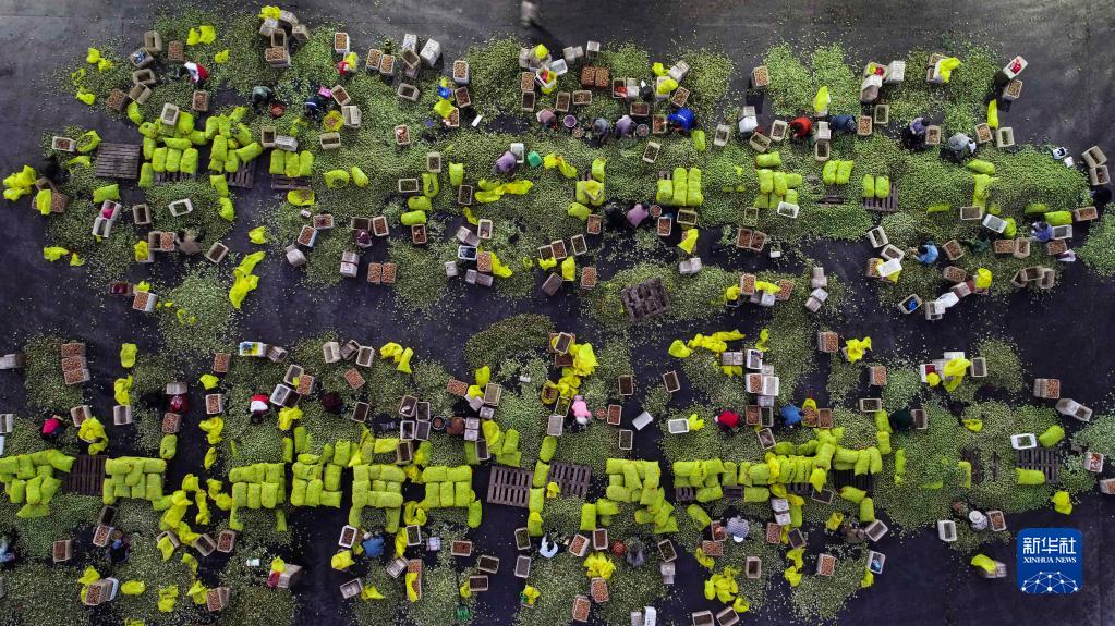 9月2日清晨,在河北省遵化市東舊寨鎮石橋頭村,村民剝核桃青皮(無人機照片)。
