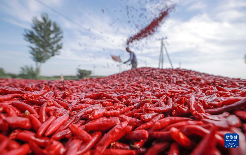 9月8日,河北省玉田縣亮甲店鎮農民在場院晾曬辣椒。