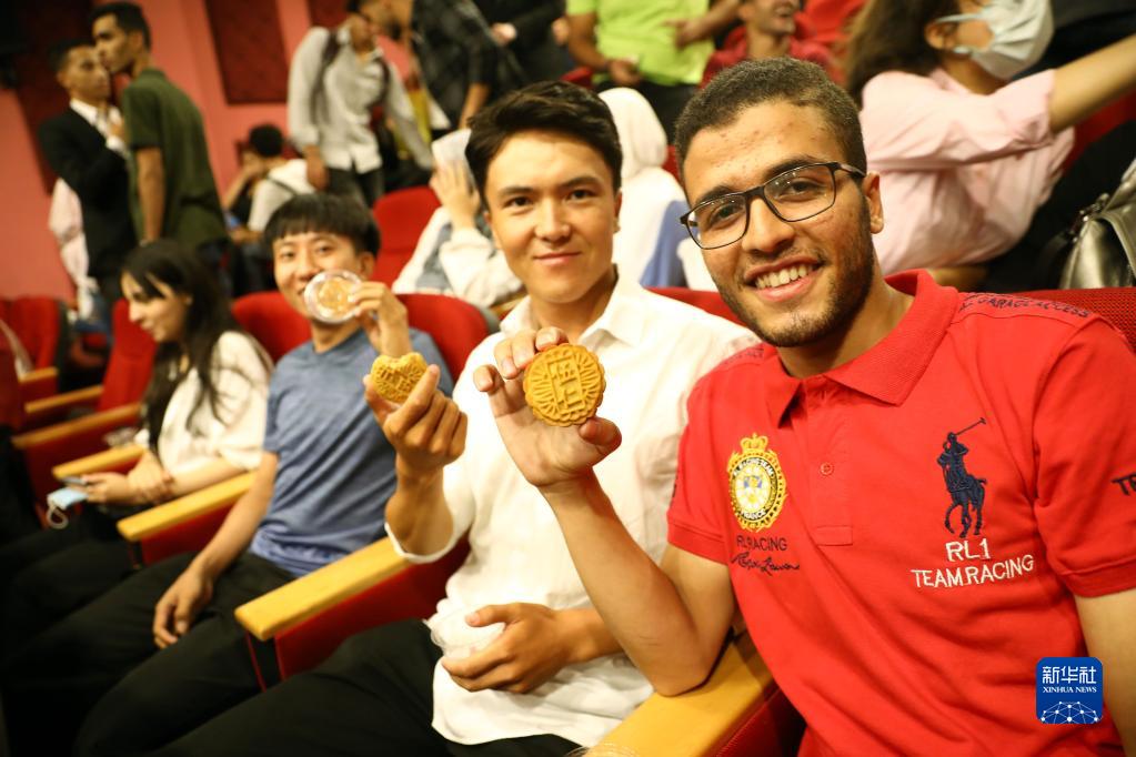 9月8日,在埃及開羅,來自埃及各高校的學生手拿月餅拍照。