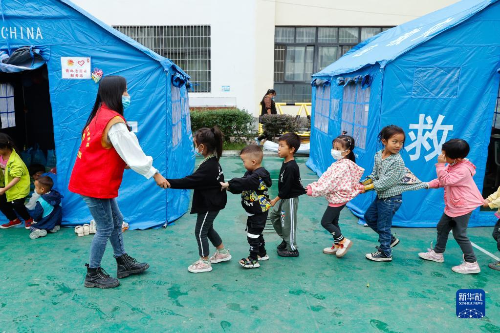 9月10日,在四川省甘孜州瀘定縣第二中學校地震災后臨時安置點,羅蓮(前左一)帶著孩子們排隊準備進入“帳篷課堂”。