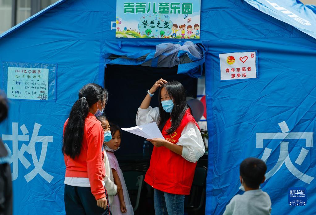 9月10日,在四川省甘孜州瀘定縣第二中學校地震災后臨時安置點,羅蓮(右二)在登記準備進入“帳篷課堂”的孩子姓名等信息。