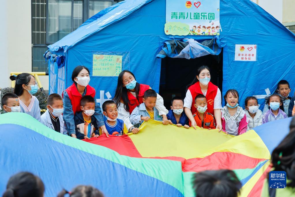 9月10日,在四川省甘孜州瀘定縣第二中學校地震災后臨時安置點,羅蓮和其他志愿者老師帶著來自地震重災區得妥鎮的孩子們一起玩彩虹傘游戲。
