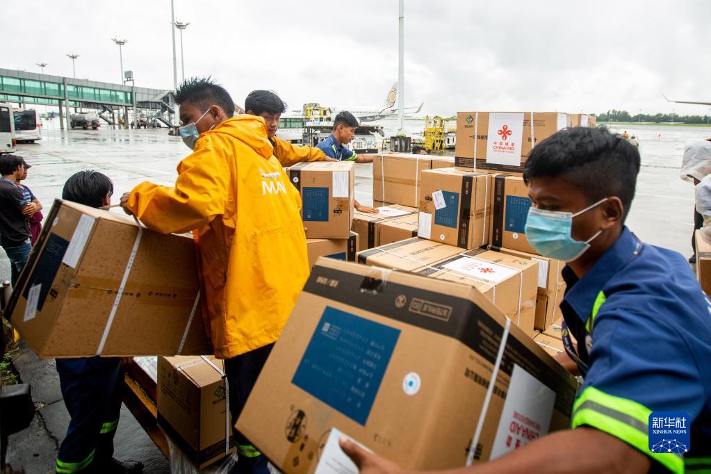 9月9日,在緬甸仰光國際機場,工作人員搬運中國援助的新冠疫苗。
