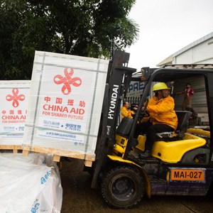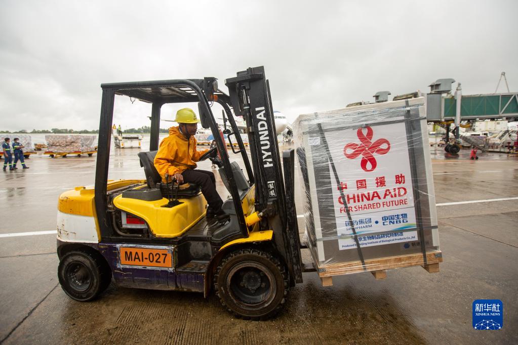9月9日,在緬甸仰光國際機場,工作人員搬運中國援助的新冠疫苗。