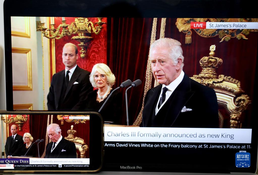 英國登基委員會10日在位于倫敦的圣詹姆斯宮正式宣告查爾斯三世為英國君主。這是在英國倫敦拍攝的查爾斯三世在圣詹姆斯宮發表講話的直播畫面。新華社記者李穎攝