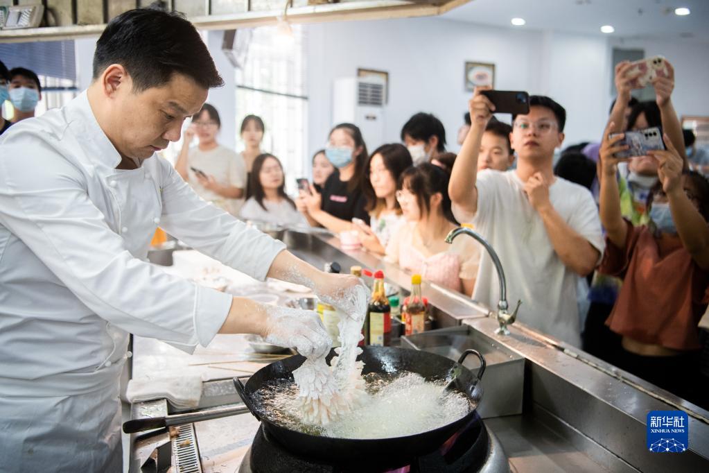 9月9日,鄒志平在《中國名菜鑒賞》課堂上制作珊瑚魚。