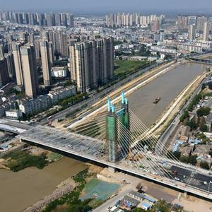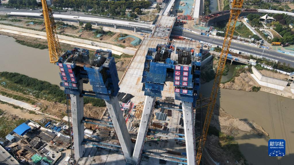 9月11日,施工人員在中鐵四局引江濟淮工程江淮溝通段金寨南路橋項目現場作業(無人機照片)。中秋假期期間,引江濟淮工程江淮溝通段各項目建設工地的施工人員堅守崗位,加緊施工,確保工程進展順利。新華社記者 劉軍喜 攝