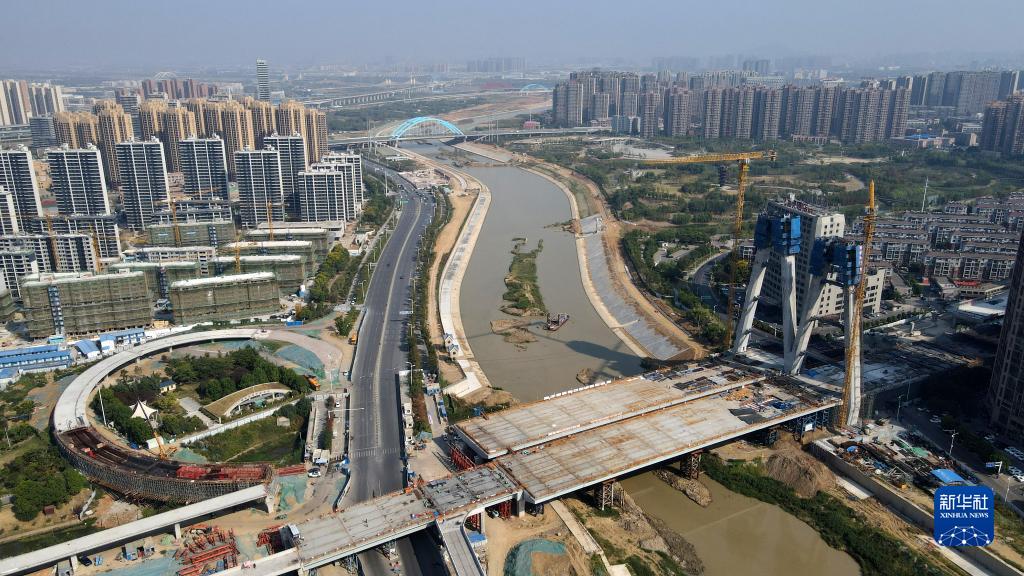 建設施工中的中鐵四局引江濟淮工程江淮溝通段金寨南路橋項目現場(9月11日攝,無人機照片)。新華社記者 劉軍喜 攝