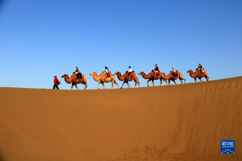 9月10日,游客在甘肅省敦煌市鳴沙山月牙泉景區游覽。