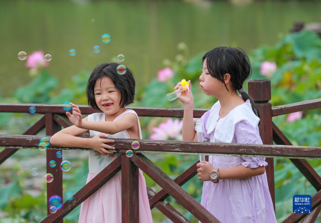 9月11日,小朋友在貴州省銅仁市玉屏侗族自治縣茶花泉景區吹泡泡。