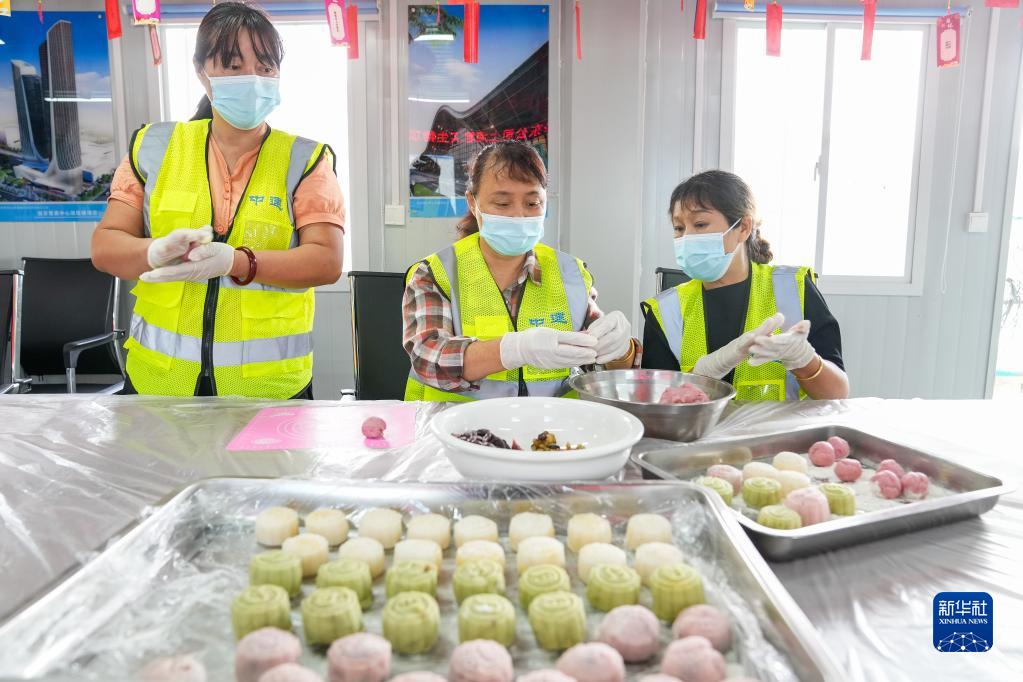 9月11日,建設者在中建三局華東公司上海分公司君實生物項目部開展的“工地慶中秋 佳節情意濃”主題活動上做月餅。